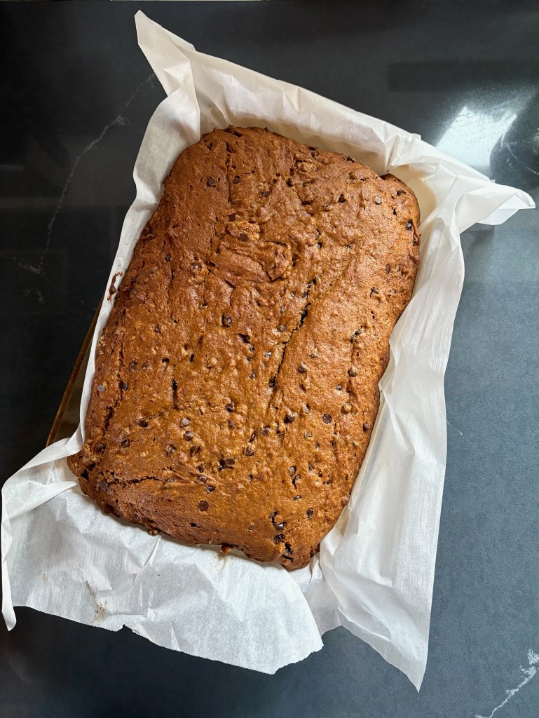 1 can pumpkin, 3.5 c white whole wheat flour, 2 t soda, 2 t cinnamon, 1 t nutmeg, 1/2 t sea salt, 2 c sugar, 1 c canola oil, 3 eggs, 8 oz banana puree, 1/2 c water, 1/2 c pb, 11 oz mini chocolate chips