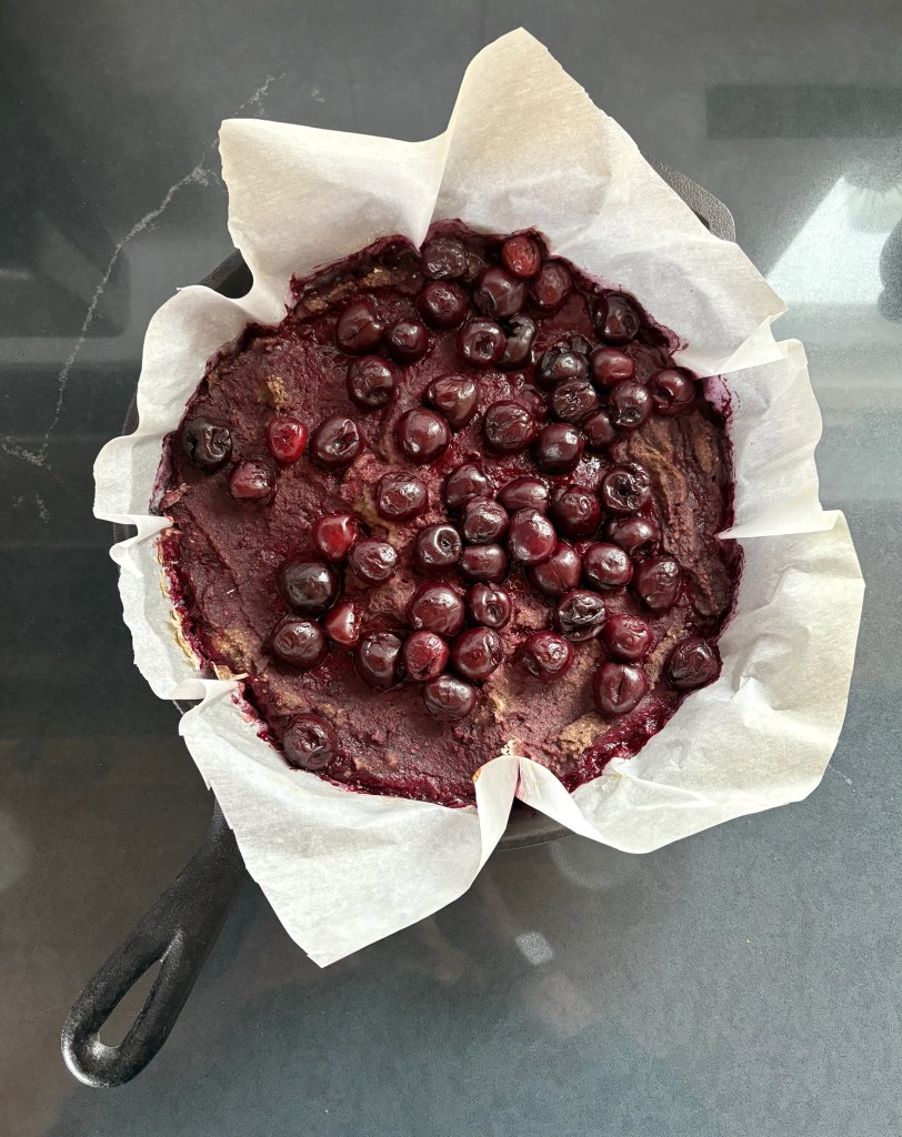 1 c wheat chef, 2 c pureed cooked scarlet runner beans, 1 c ground flax+chia, pinch sea salt, 2 T stevia, 2 T vanilla, 2 c cherries