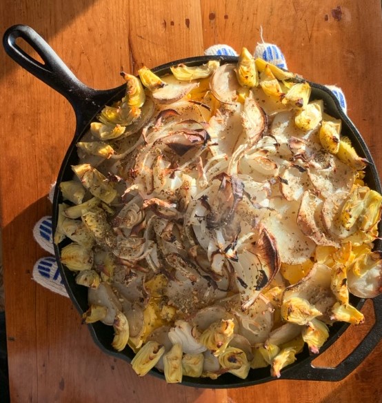 olive oil, vegetable bouillon paste, 1 can diced tomatoes; unpeeled delicata squash, unpeeled potatoes, onion, sliced thin; 1 can artichoke heart quarters, drained; black pepper, Italian seasoning, dried minced garlic