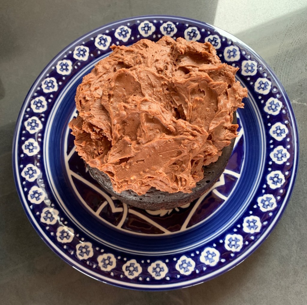 1.5 c flour, 1/2 c sugar, 1/4 c cocoa, 1 t soda, 1/2 t salt, 1/2 t cinnamon, 1/4 t powder, 1/2 t vanilla, 1/2 c canola oil, 1 T distilled vinegar, 1 c warm water, frosting: 8 oz earth balance buttery sticks, room temp; 1/2 c cocoa, 1 T vanilla, 2 c powdered sugar