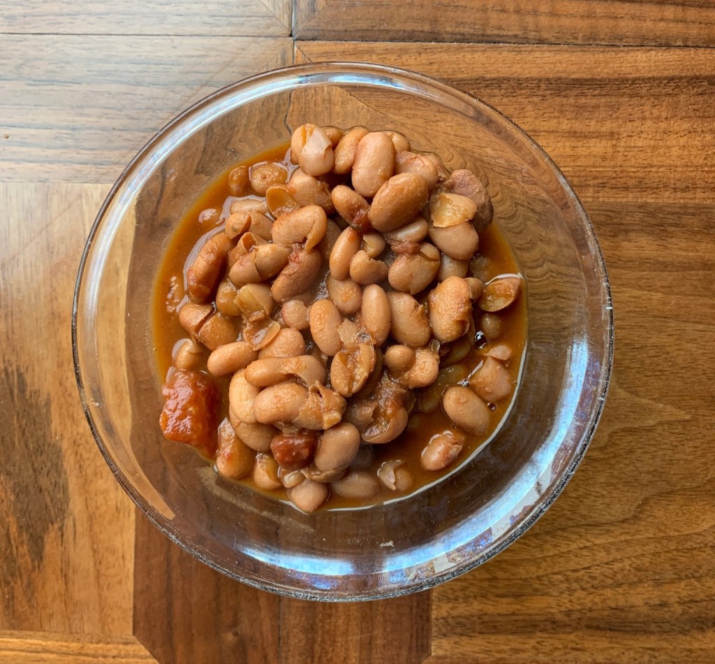 2 lbs dried pinto beans + 1 T sea salt soaked overnight covered in 2 inches warm water, 1/3 c molasses, 1 T olive oil, 1 can diced tomatoes, 1 tiny can tomato paste, chipotle tabasco, smoked paprika, onion powder, oregano, dried mustard, 1/4 c balsamic, 1/4 c oj