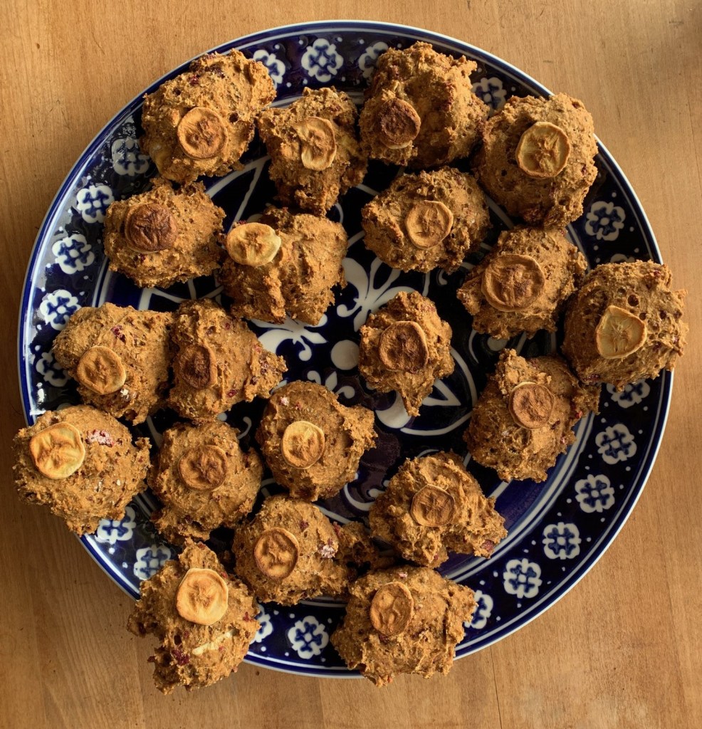 3 (4-oz size) containers gerber bananas, 1/3 c molasses, 1/2 c cashew butter, 1 t salt, 1 t cinnamon, 1 T vanilla, 1 T powder, 1/4 c chia, 1 c freeze dried fruit, 3 c white whole wheat flour, 1/2 c unsweetened vanilla almond milk