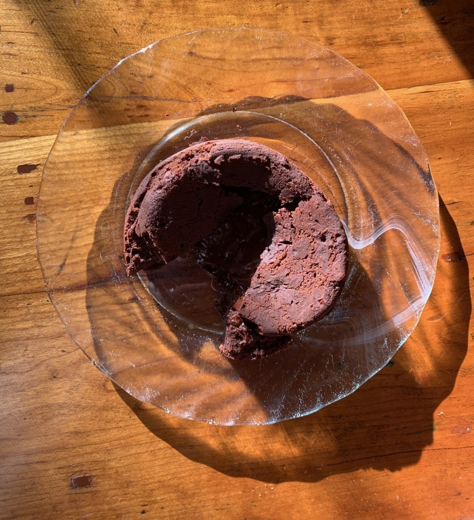 whisk sugar, salt, into melted chocolate; whisk in eggs for 50 strokes, whisk in cocoa, divide into buttered and cocoa-d ramekins, 450 F, 7-9 minutes, stand 1 minute, turn out, serve