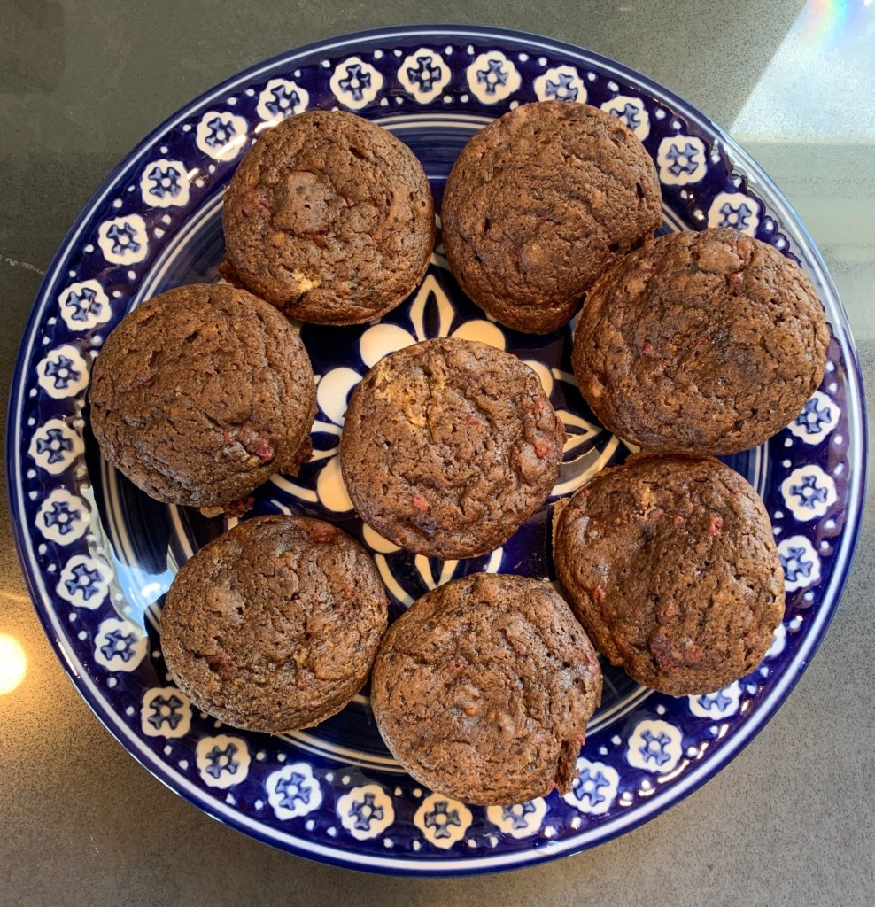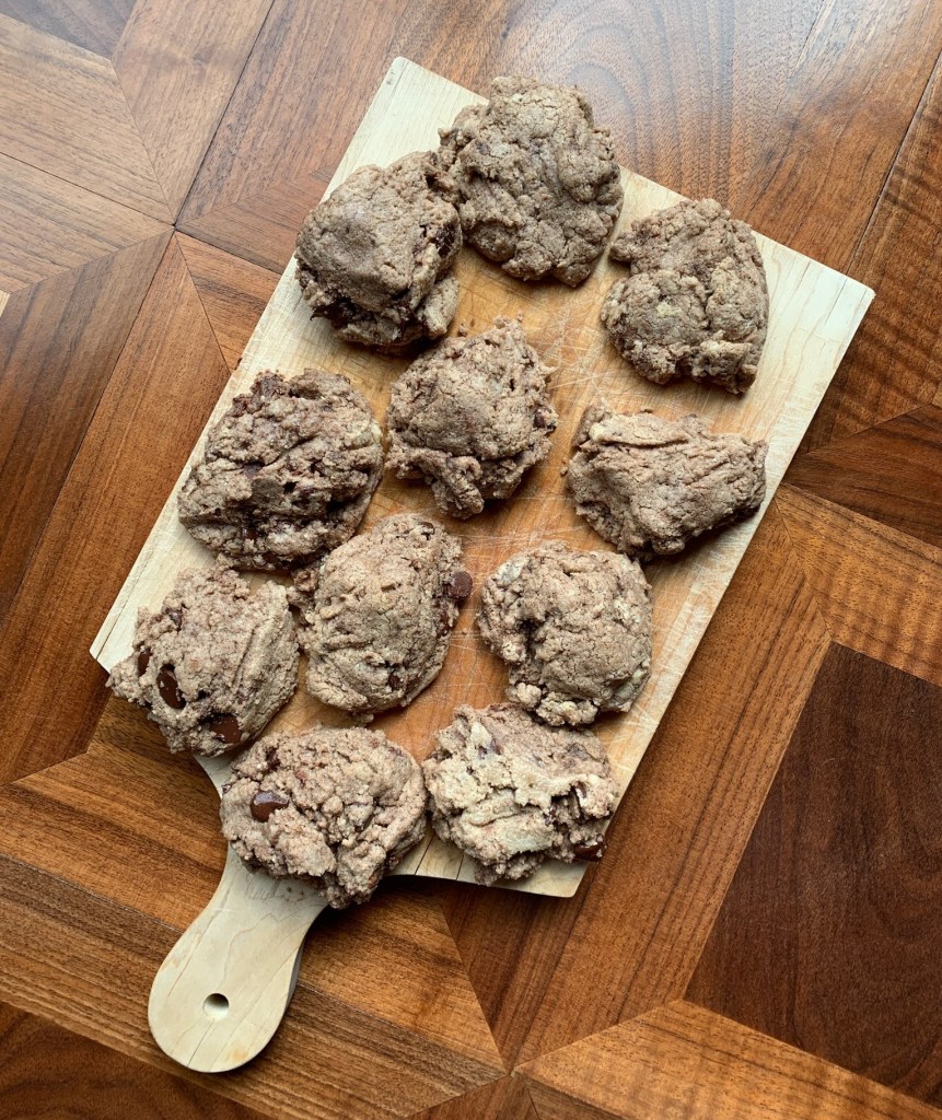 2 c oat flour, 1 c almond flour, 1/2 c sugar, 2 T namaste egg replacer, 1 t kosher salt, 1 t soda, 1 c soft pecan butter, 1/2 c soft coconut oil, 1/2 c maple syrup, 2 t vanilla, 2 c bittersweet chocolate chips