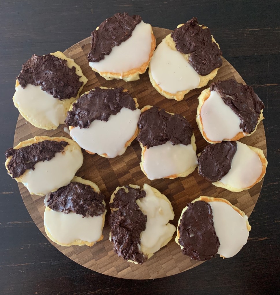 cookies: cream butter, sugar; beat in rest; bake on silpat, 375 F, 8-10 minutes, cool; glaze: mix all but chocolate, adding water slowly, frost half of each cookie, add chocolate to remaining glaze, frost other halves