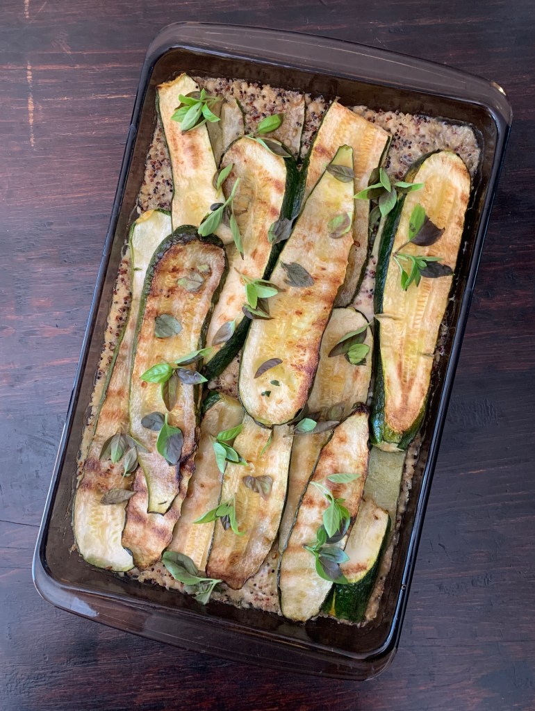 arrange grains, zucchini in an oiled baking dish; 400 F, 20 minutes; broil; add basil