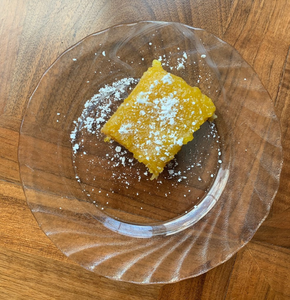 crust: chop together, bake on parchment in a 9×9 pan, 325 F, 30 minutes; filling: boil juice, eggs, sugar, cornstarch, salt 30 seconds or just until thickening; remove from heat, add rest; pour on crust, bake 10 minutes or until just set, chill, slice, add toppings