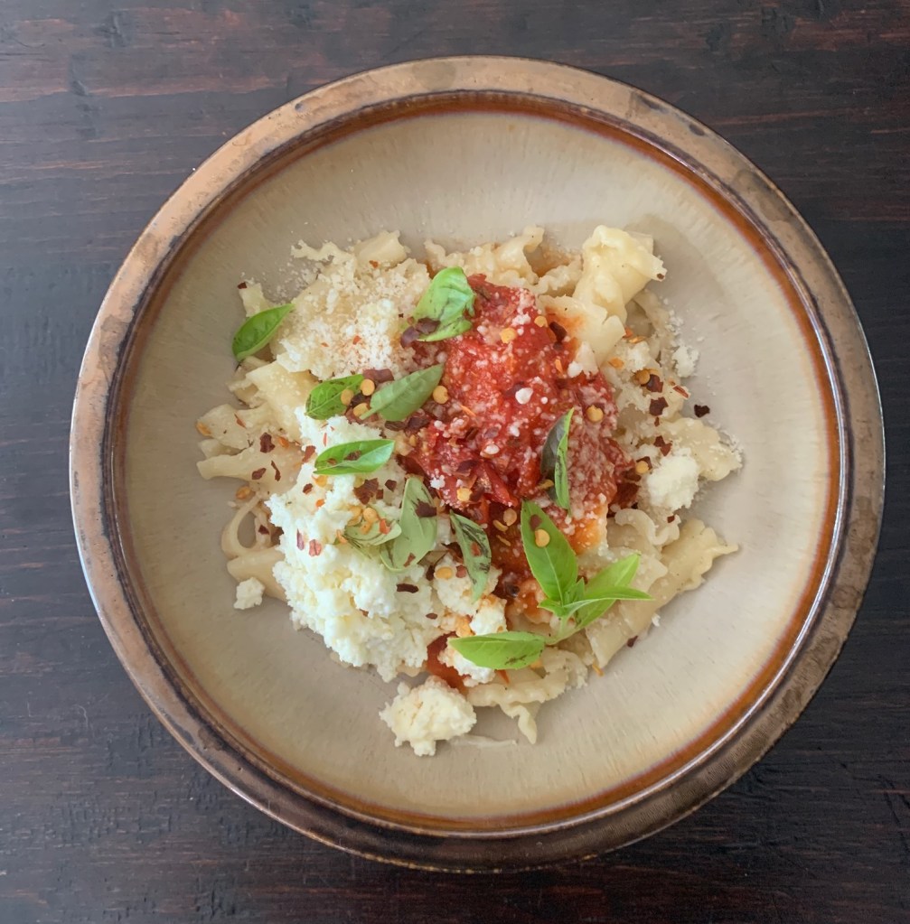 1 lb pasta, cooked, tossed with butter, salt, pepper; cheese: 1 gallon milk, 1/2 – 1 c lemon juice, salt; sauce: 5 lbs tomatoes, grated; 1 t salt, tiny can tomato paste, bay leaf, basil sprig, 1 t garlic powder, 2 T olive oil; toppings: basil, pecorino, red pepper flakes