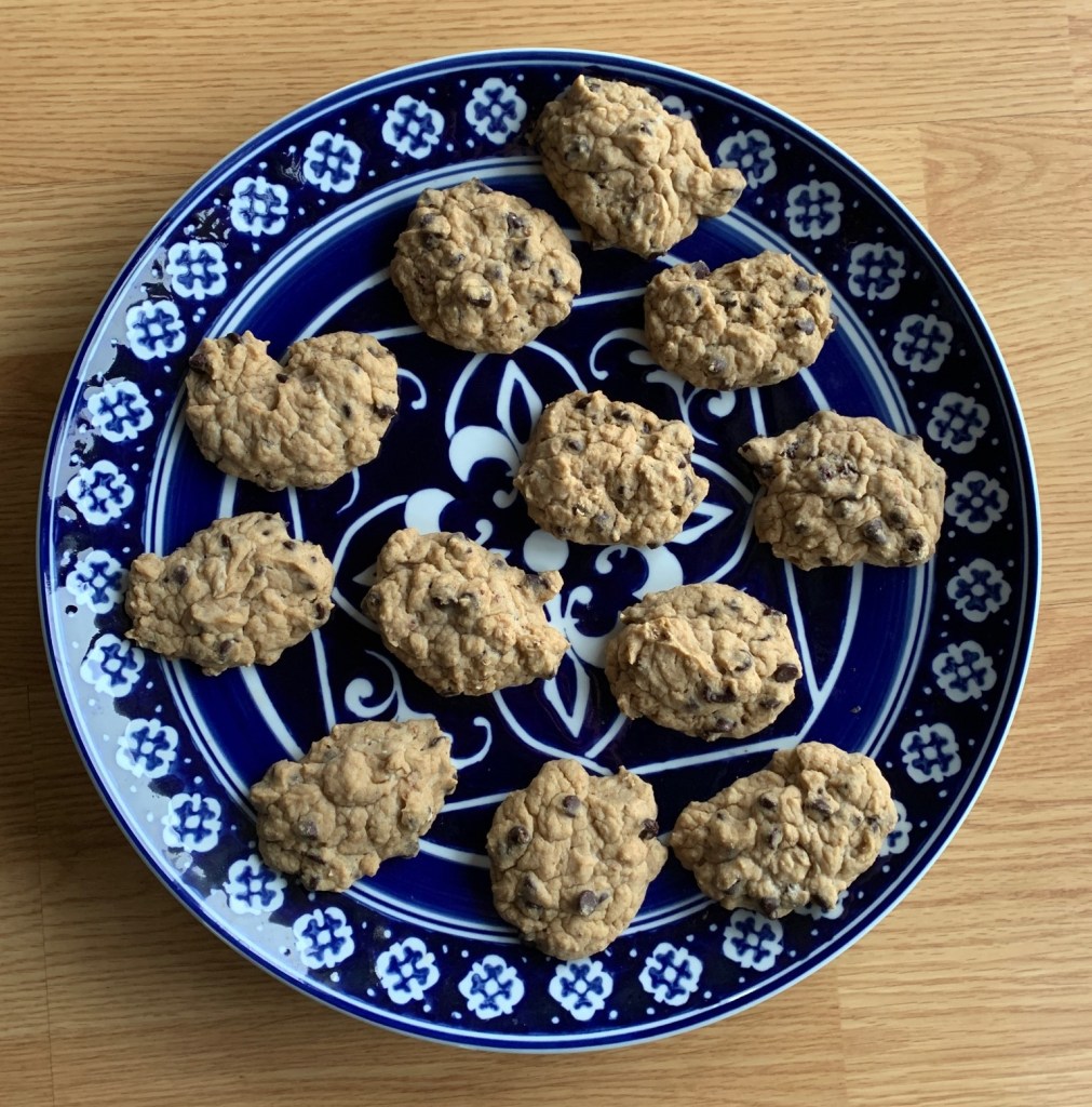 3 (4-oz size) containers gerber bananas, 4 packets stevia, 2 t powder, 1 t vanilla, 1 t kosher salt, 1/4 c ground flax seed, 1/4 c chia seed, 1 c frozen raspberries, 1 c oats, 1.5 c white whole wheat flour