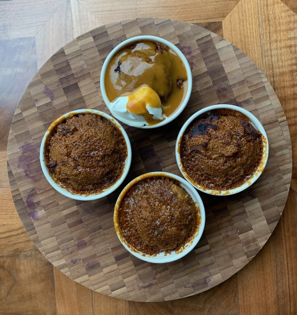 pudding: 2 T butter, 1/2 c chopped dates, 2 t lemon zest, 1 t soda, 1/4 c hot water, 1 c pumpkin puree, 1/2 c brown sugar, 1 t cinnamon, 1 t cardamom, pinch sea salt, 1 c flour; sauce: 1/2 c brown sugar, 1/3 c pumpkin puree (rest of can), 1/4 c cream, pinch sea salt, 1 stick butter, 2 T bourbon; toppings: crème fraiche, sea salt