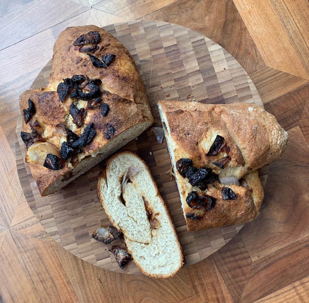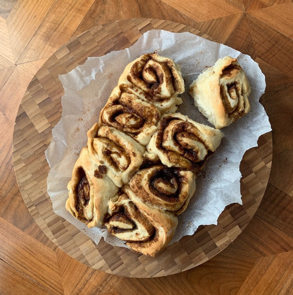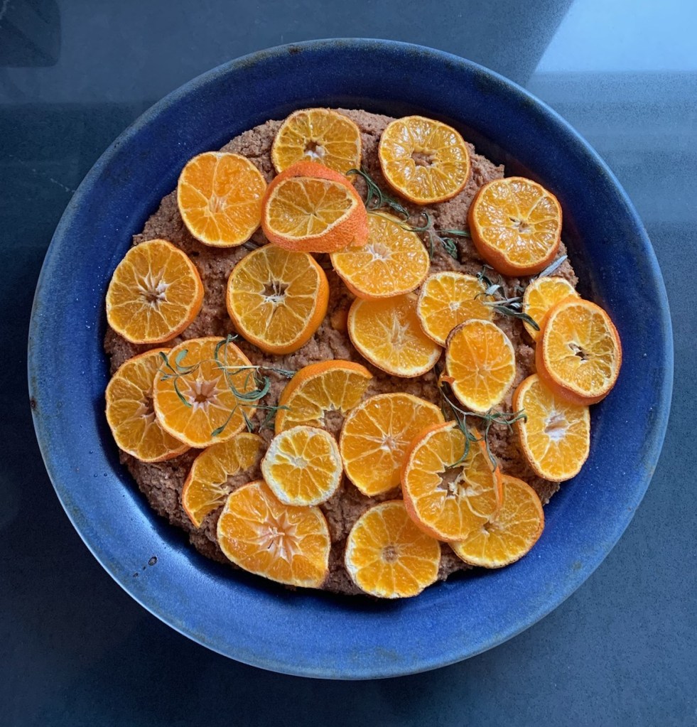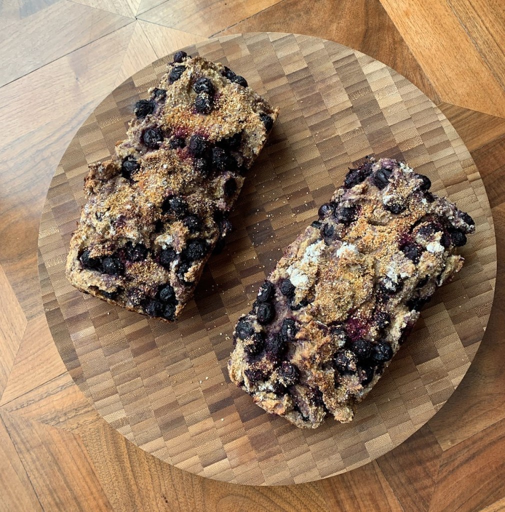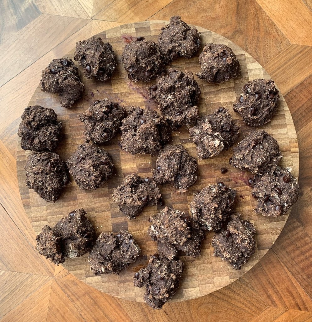 4 (4-oz size) containers gerber bananas, 6 packets stevia, 2 namaste egg replacer eggs, 1 t soda, 1 t kosher salt, 1 T vanilla, 1 t cinnamon, 1 T cardamom, 1/2 c lilly’s stevia-sweetened chocolate chips, 1 c cocoa, 2 c white whole wheat flour