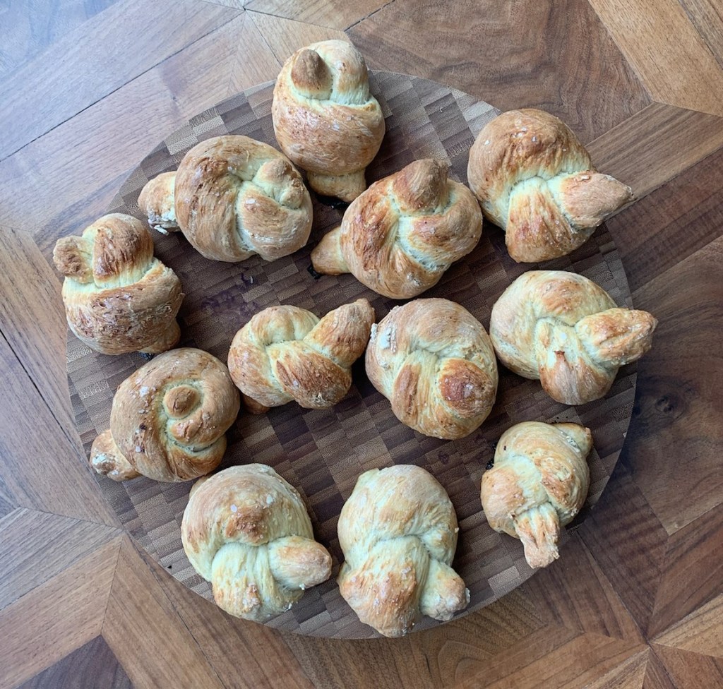 knead 5 minutes, rise 1 hr; make 12 knots, place on silpat on 2 rimmed baking sheets, add toppings, rest 30 minutes; 400 F, 25 minutes
