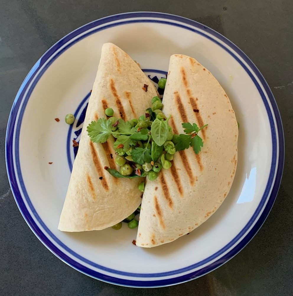 2 small tortillas, 2/3 c frozen peas+sea salt+lemon juice+herbs+red pepper flakes, 2 slices miyokos smoked english farmhouse cheese