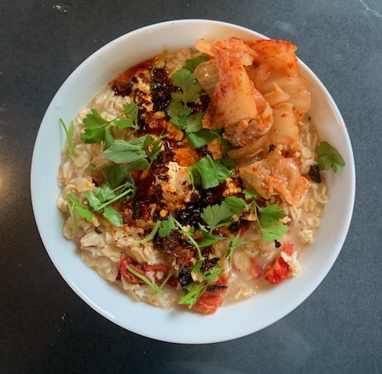 1 c oats, 2 c water, 1 c dry-packed sundried tomatoes, sea salt & pepper, 2 T miyokos roadhouse cheddar, 1 T chili crisp, 1 T herbs, kimchi