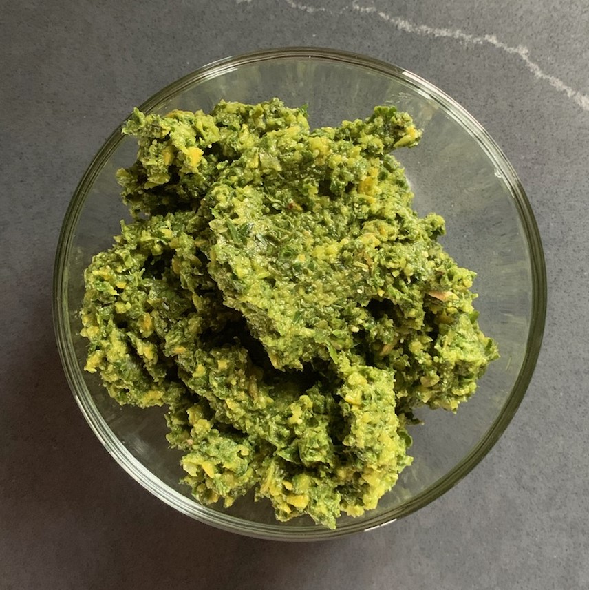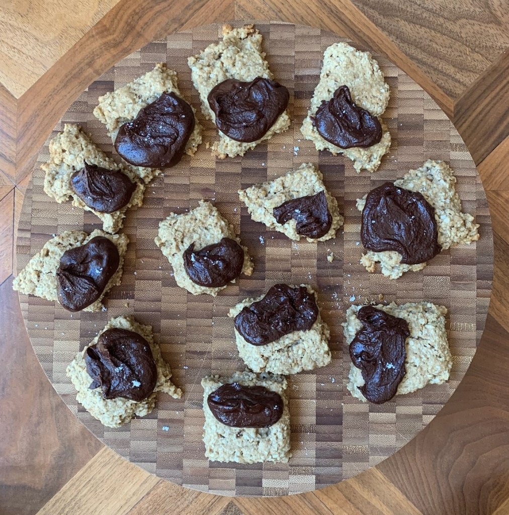 mix all but chips, spoon onto parchment-covered stone, 425 F, 18 minutes, top with melted chips
