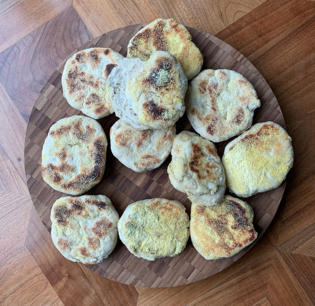 stir; rest, covered, 1 hour; fold 8x, rest, covered, cool place, 16 hours; fold 8x, rest, covered, 5 hours; form flattened balls, dip both sides in cornmeal; cook in a lightly-oiled nonstick pan, covered, medium heat, 8 minutes/side or until puffy and golden; cool in covered container 1 hour, perforate outsides with fork