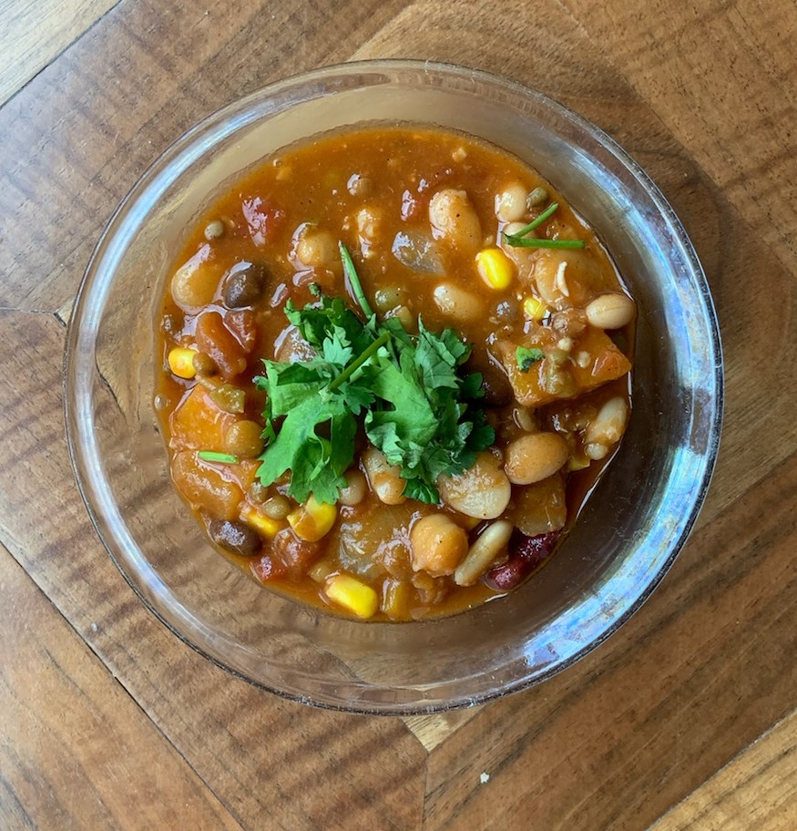 1 lb mixed beans soaked overnight in 2-inches water+1/2 t salt; 1 halved onion, 1 chopped onion, 1 bay leaf, 2 T olive oil, 4 t minced garlic, 1 can diced tomatoes, 1 tiny can tomato paste, 1 c frozen corn, 2 c cubed butternut squash, 2 T chili powder, 1 t cumin, 1 t sugar, 1 t salt, cilantro