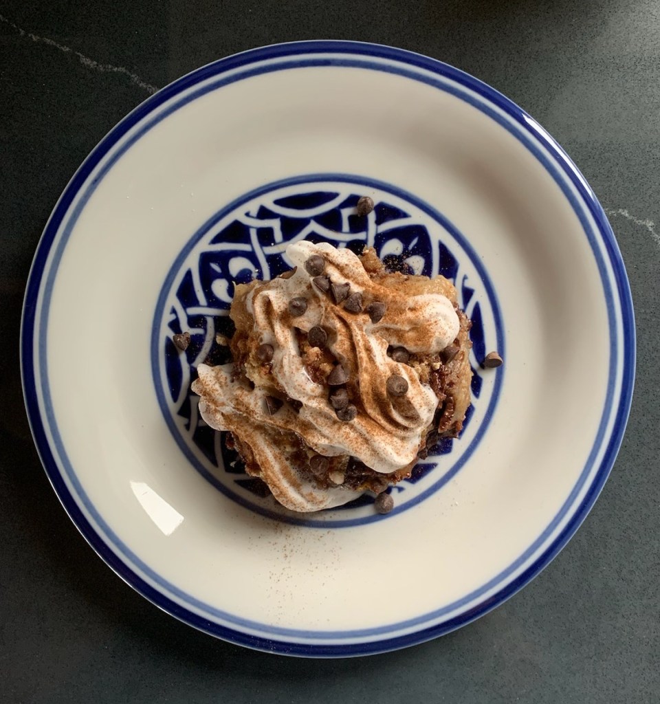 microwave in mug until set, turn out; top with vegan whipped cream, more cinnamon, more chocolate