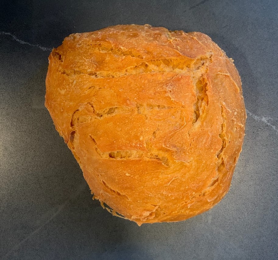 stir; rest, covered, 1 hour, fold 8x; rest, covered, 8 hours, fold 8x; rest, covered, 13 hours, form loose ball; rest 20 minutes, slash top; 425 F in dutch oven, lid on, 25 minutes; lid off, 20 minutes