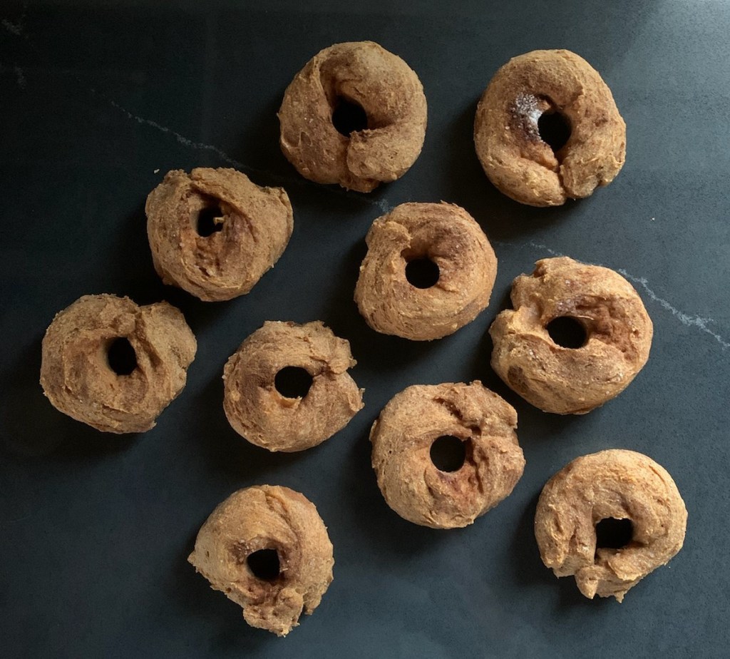 stir; rest, covered, 1 hour, fold 8x; rest, covered, 1 hour; place dough in silpat donut pans, sprinkle with more stevia, more salt, cinnamon; rest 20 minutes; 350 F, 15 minutes