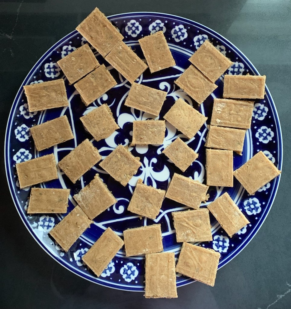 rest flax mixture 10 minutes, knead in rest, roll out with springerle rolling pin on silpat-covered stone, 325 F, 20 minutes, cool & slice