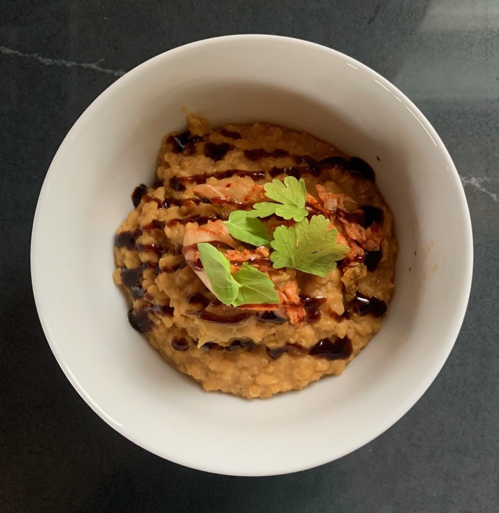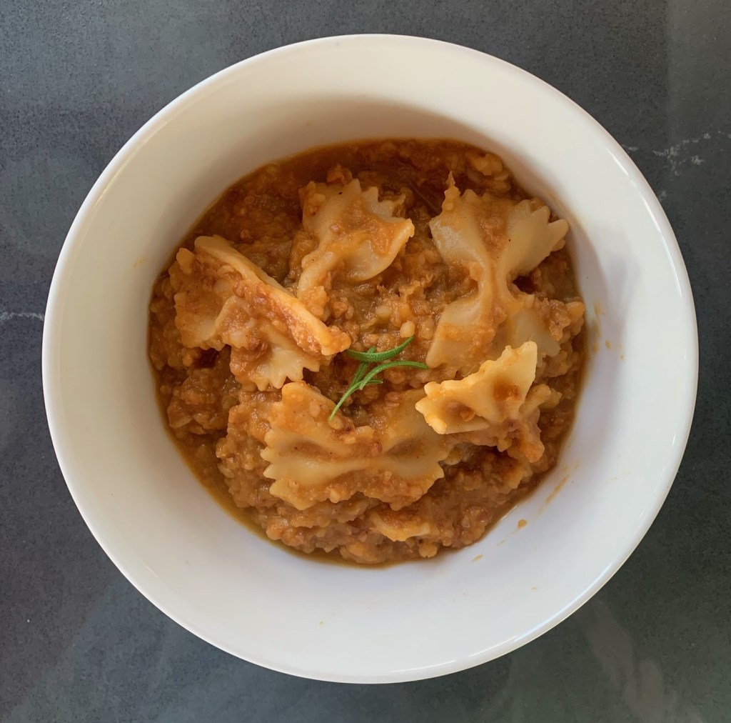1 sliced shallot, 1 smashed clove garlic, 1 T olive oil, 1 T miso, 1 T smoked paprika, 1/2 t rosemary, 1 c kasha, 1 c bowties, 1 can pumpkin, juice of 1 lemon