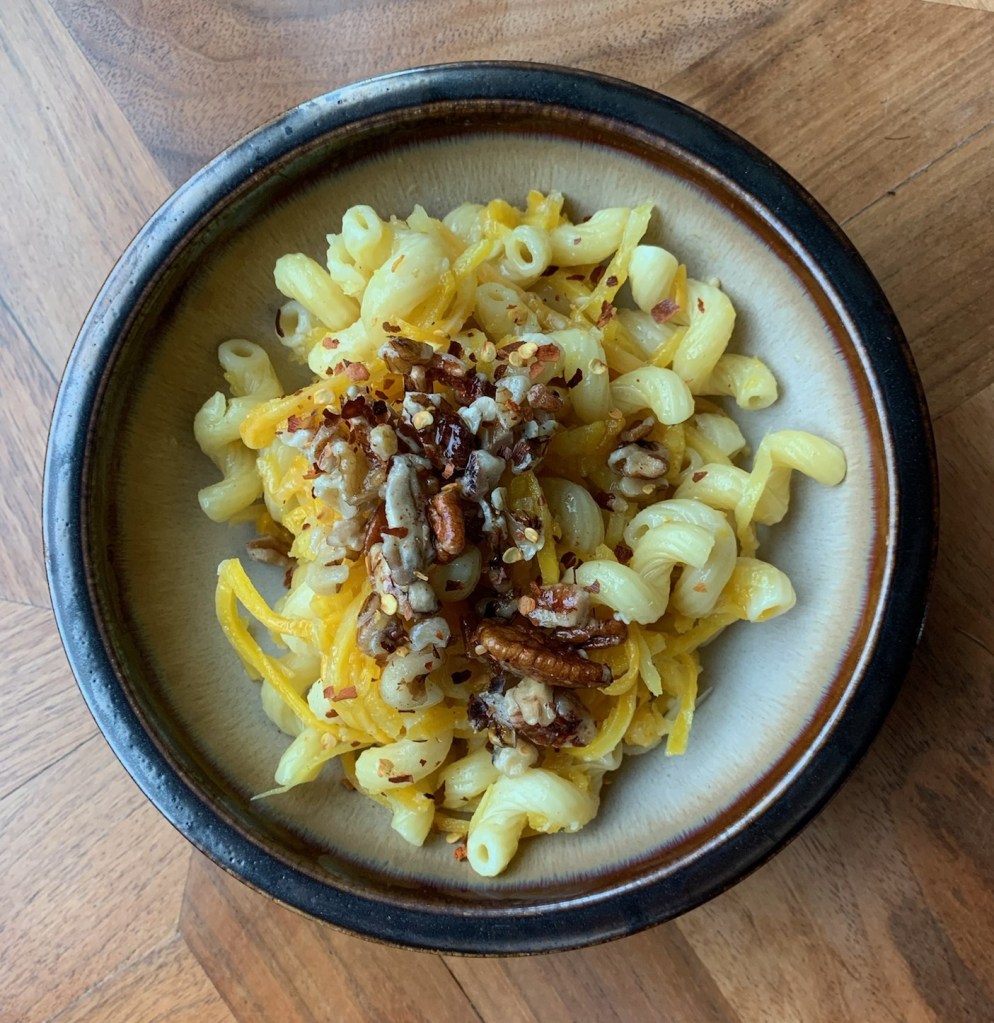 1/2 c chopped nuts+juice of 1 lemon+1 T olive oil+s&p; 24 oz frozen butternut squash noodles, 1/2 c olive oil, kosher salt & pepper, 1 lb pasta cooked al dente, 5 crushed cloves garlic, 1/2 t red pepper flakes