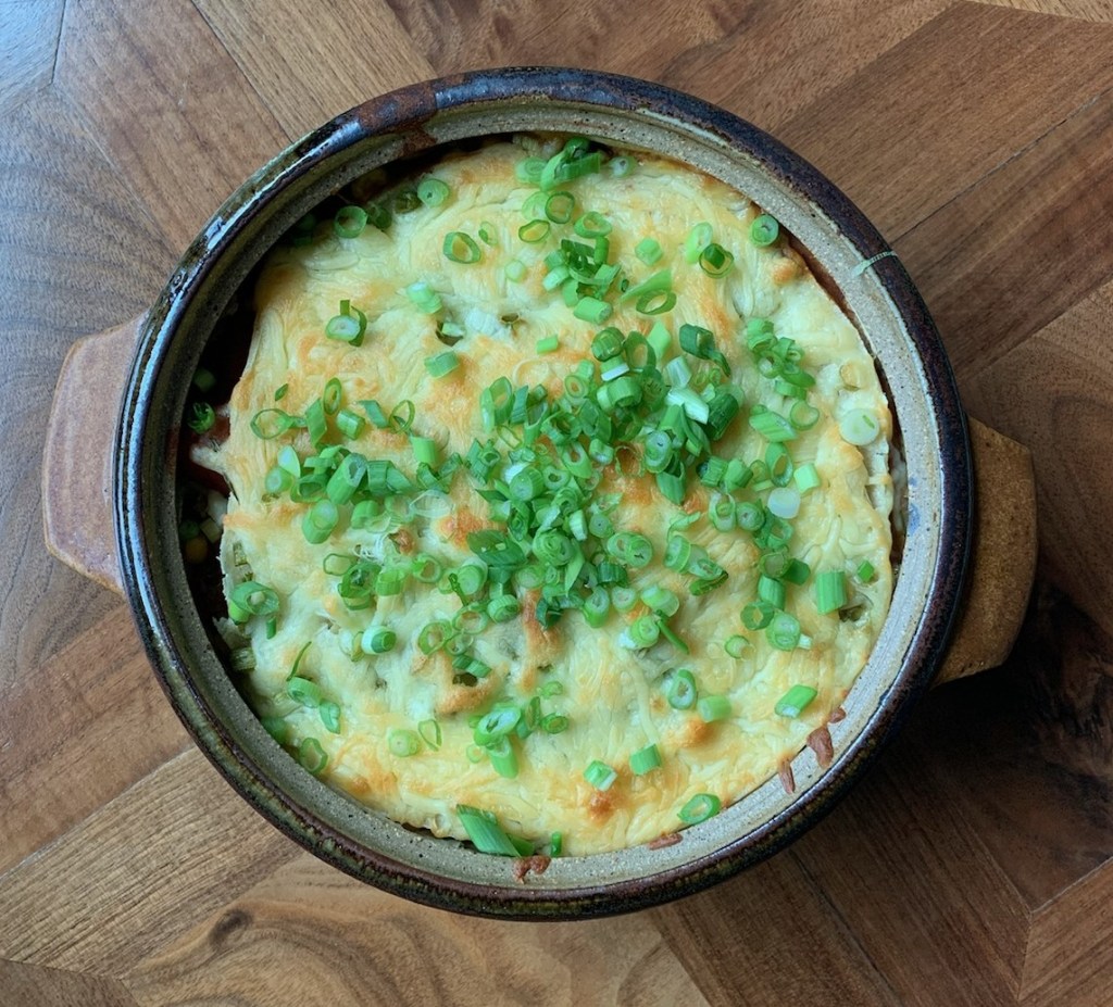 1 lb kidney beans, soaked overnight in 2-inches water, simmered in 2-inches water until tender; 2 diced onions, 6 sliced scallions, 1 can diced tomatoes with liquid, 1 can tomato sauce, 2 t minced garlic, 1 T chili powder, 1 T cumin, 1 T olive oil, s&p, 1 T tabasco, 12 corn tortillas, 1 bag frozen corn, 2 c shredded vegan cheese, 1 tiny can sliced olives, drained