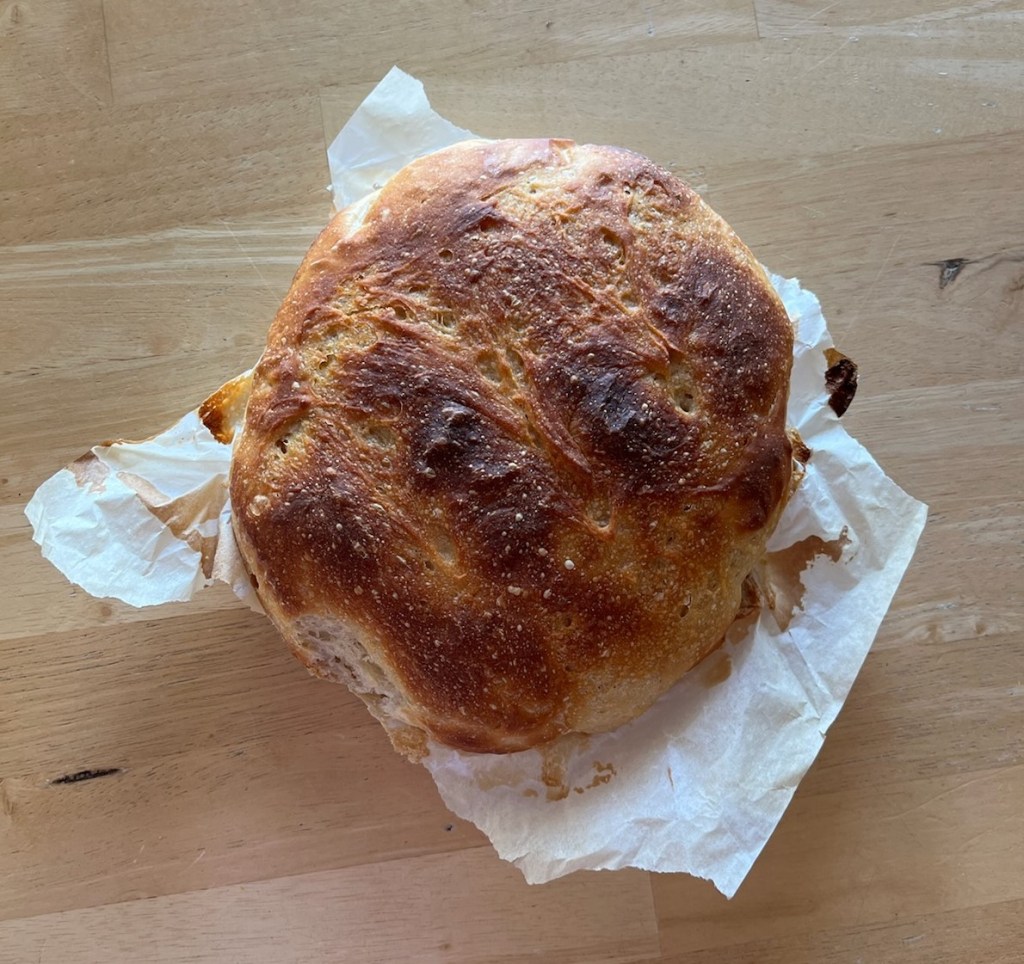stir, rest 1 hour; fold, rest 6 hours; fold, rest 11 hours; place in parchment-lined dutch oven, rest 3 hours; slash top, place in cold oven set to 425 F, covered, 35 minutes; uncovered, 15 minutes; on oven rack, 10 minutes; oven off, 5 minutes; rests: covered, room temperature; folds: 8x