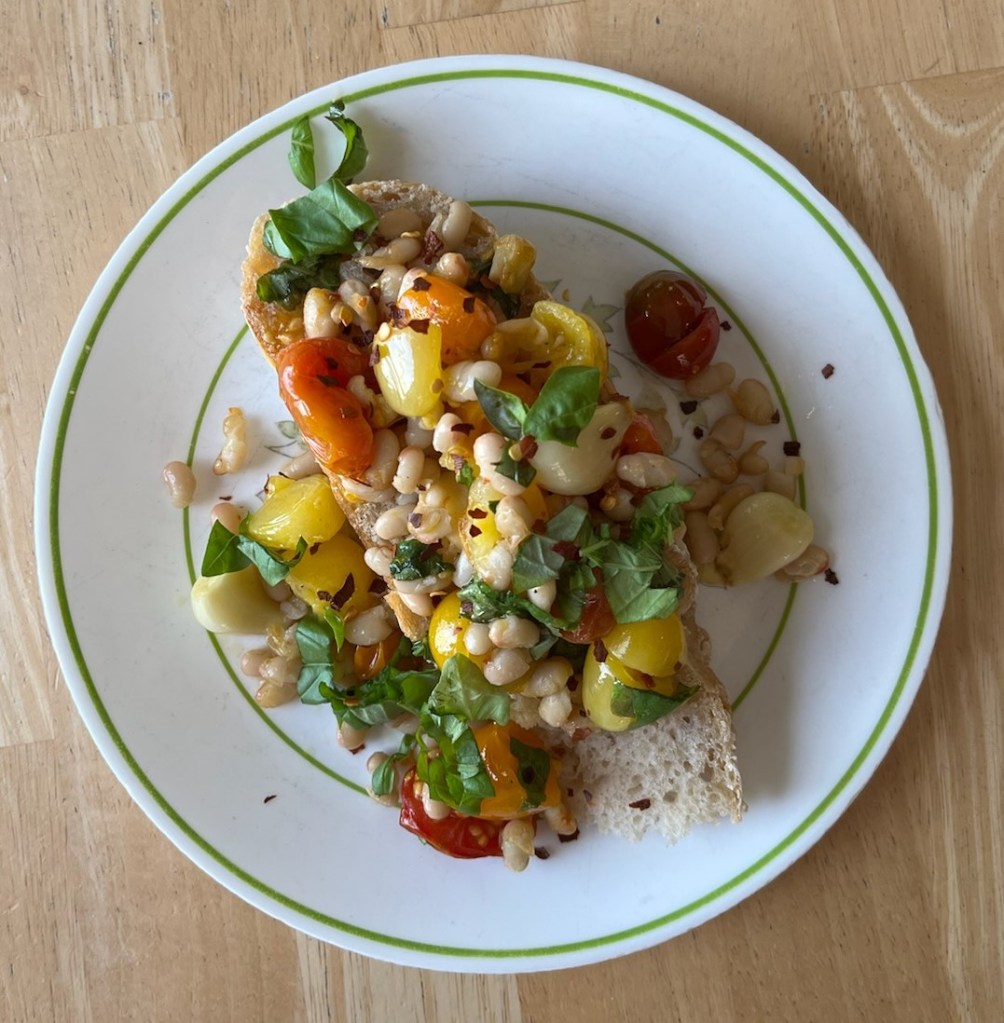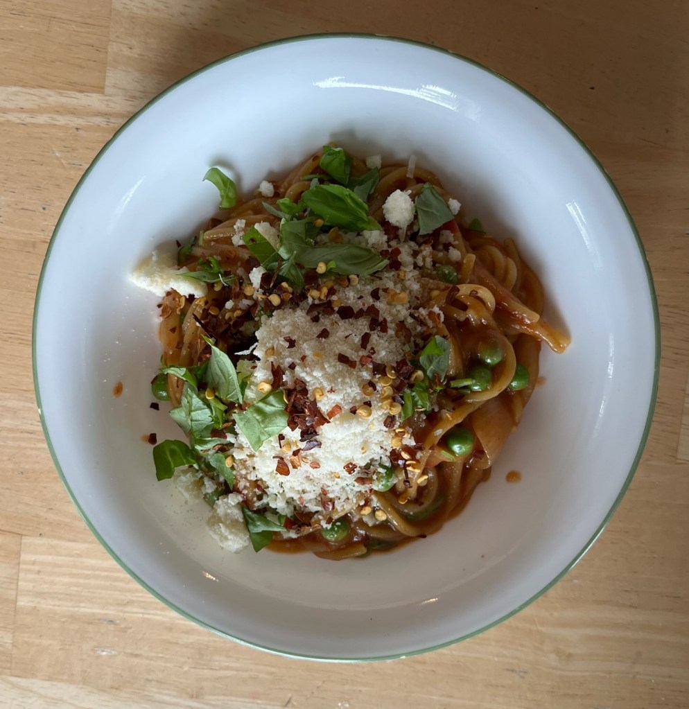 olive oil, 1 sliced onion, 4 smashed cloves garlic, kosher salt+pepper+red pepper flakes, 1 T balsamic vinegar, 1 lb spaghetti, 8 chopped big tomatoes, 1 c basil, 1/2 c vegan parm, 8 oz peas