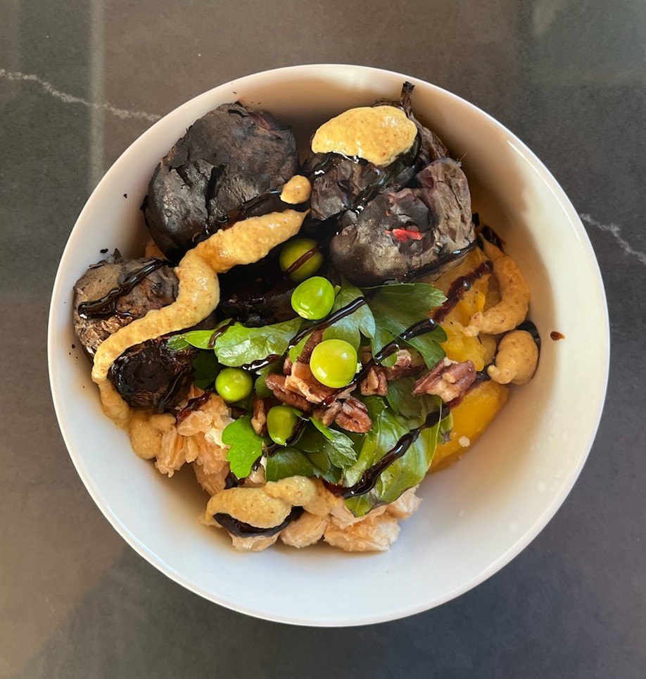 2 grilled beets, 1 c grilled acorn squash, 1 c cooked royal corona beans, 1 T lemon juice, s&p; toppings: pecans, herbs, ground cherries, dijon, balsamic reduction