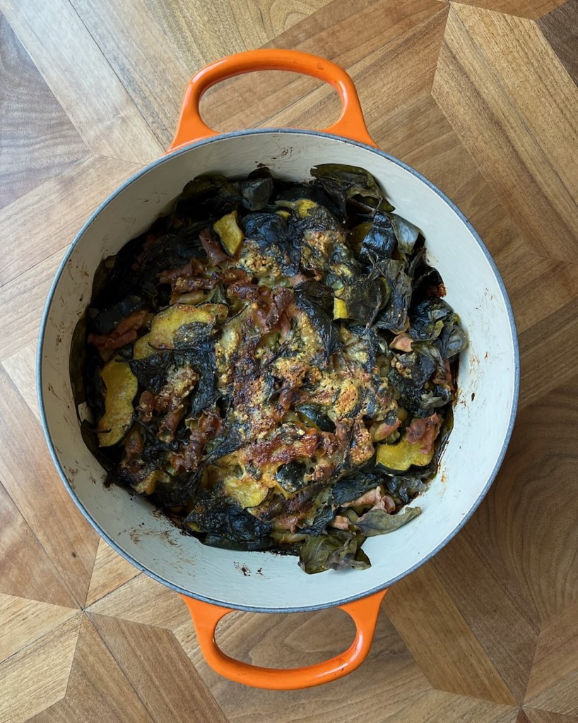 1 egg, 1 c ricotta, 1 c grated parm, 1 c grated fontina, 1 1/4 c water, 3 T olive oil, 1 t kosher salt, pinch nutmeg, pinch black pepper, pinch red pepper flakes, 3 t minced garlic, 6 oz baby spinach, 3 T sage+thyme, 1 thinly sliced unpeeled acorn squash, 8 oz pasta