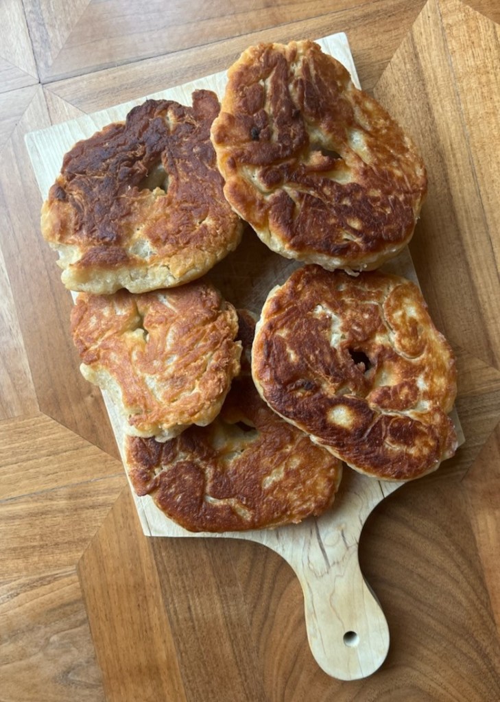 form ball; rest, covered, 2 hours, room temperature; form balls with holes with oiled hands, place on oiled wax paper, cover with oiled wax paper; rest, room temperature, 2 hours; shallow fry on both sides in canola oil; serve with cinnamon & powdered sugar