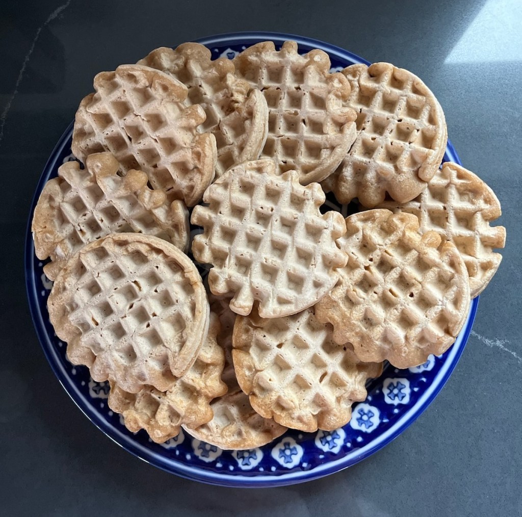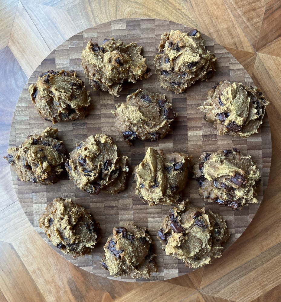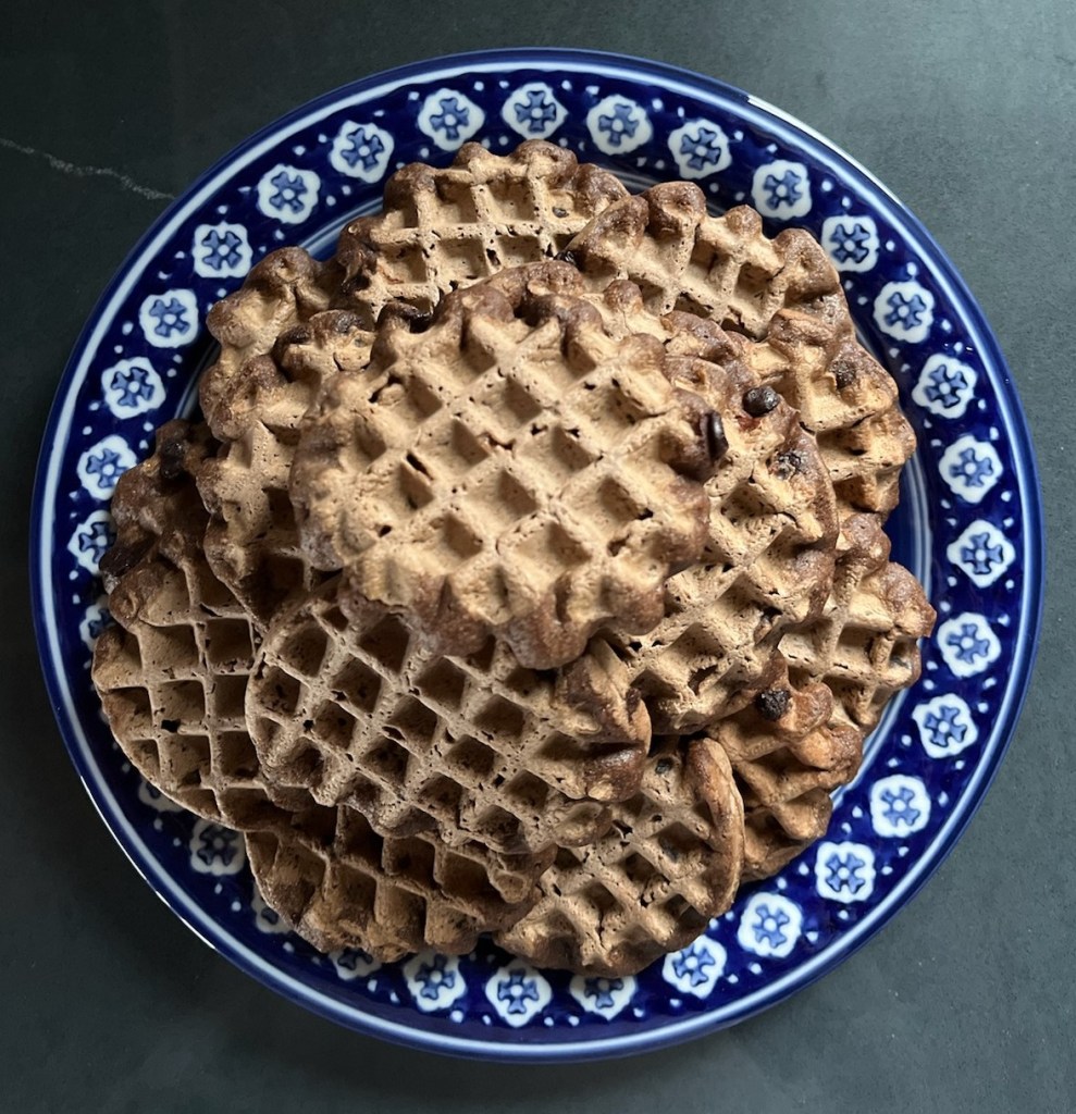 3 c white whole wheat flour, 1/4 c cocoa, 3 c warm water, 1/4 c ground flax, 1/2 t powder, 1/2 t sea salt, pinch black pepper, 12 packets stevia, 1 t ginger, 1 T pumpkin pie spice, 1/2 c lily’s stevia-sweetened chocolate chips