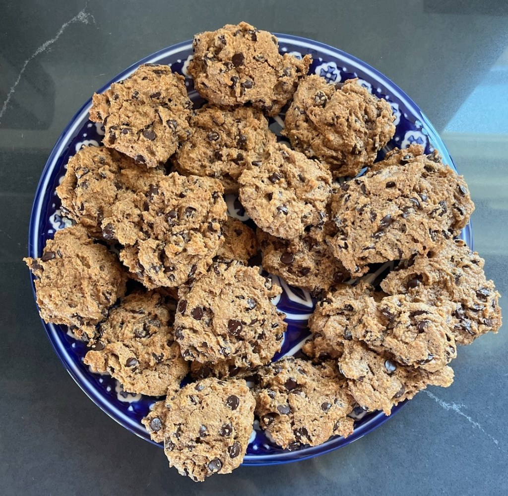 1 c almond butter, 3/4 c brown sugar, 4 oz banana puree, 1/2 t sea salt, 1 t soda, 1/2 c white whole wheat flour, 1 1/3 c lily’s stevia-sweetened chocolate chips
