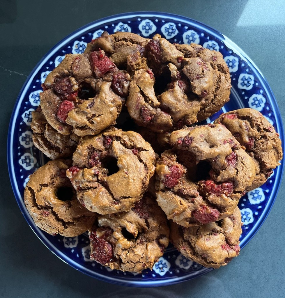 3/4 c soft almond butter, 1 c wheat chef, 1/4 c namaste egg replacer, 1 c masa harina, 1 T powder, 1 T vanilla, 1 t sea salt, 1 c molasses, 2.5 c frozen raspberries
