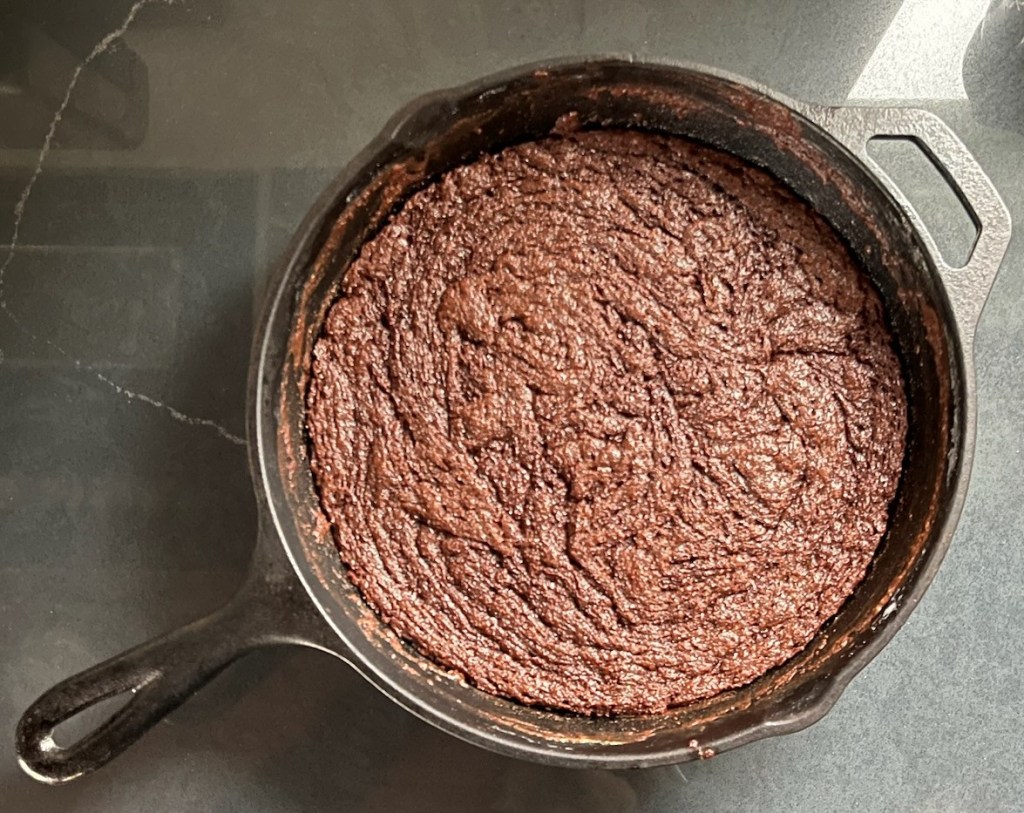 mix, pour into parchment-lined cast-iron pan, rest uncovered room temperature 8 hours, place in cold oven set to 350 F, 40 minutes