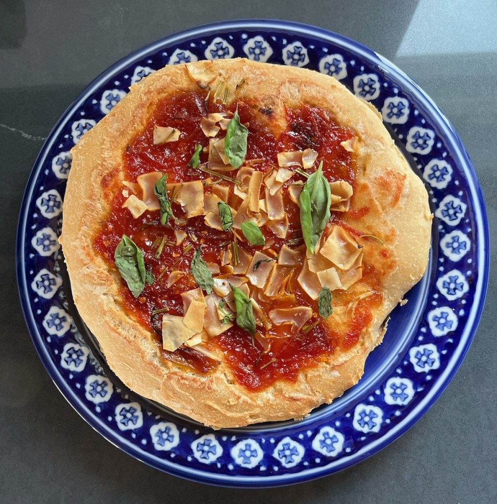 dough: 1 c wheat chef+1 c flour+1/2 t sea salt+1/4 c warm water; toppings: 1/2 c tomato jam, 2 T vegan parm, basil