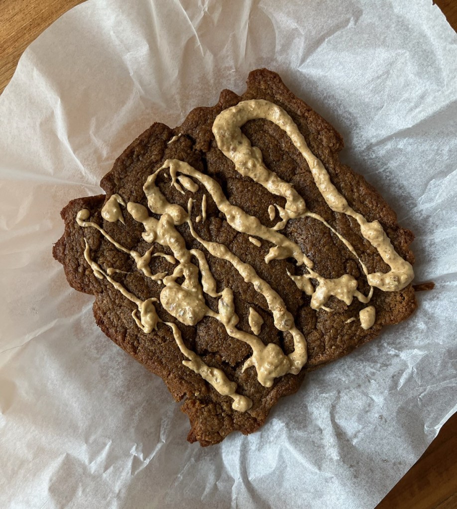 2 sticks browned butter, 1.5 c brown sugar, 2 T molasses, 1 T ginger, 2 eggs, 2 T vanilla, 2 c flour, 2 t powder, 1 t cinnamon, 1 t salt, 1/4 t allspice, 1/4 t black pepper, pinch cloves, 3 oz melted & lightly browned white chocolate