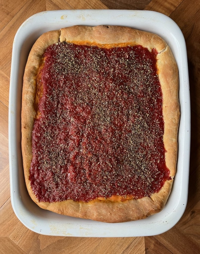 dough: dough hook 8 minutes, chill covered 24 hours, make rectangle in well-oiled 13×18 pan, rest 3 hours, form deep-dish crust; sauce: combine, rest 3 hours, pour half into dough; 425 F, 25 minutes; add rest of sauce, 425 F, 25 minutes; top with oregano, rest 1 hour