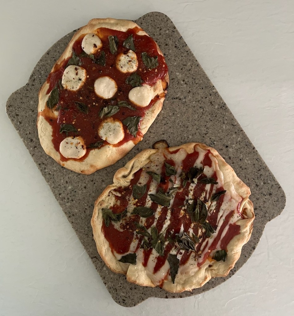 dough: 1 packet yeast, 1 c warm water, 1 T maple syrup, 1 t salt, 2 c flour, 1 T coconut oil; toppings: 1 can tomato sauce, 12 oz vegan mozzarella, basil, garlic powder, dried parsley, black pepper, red pepper flakes