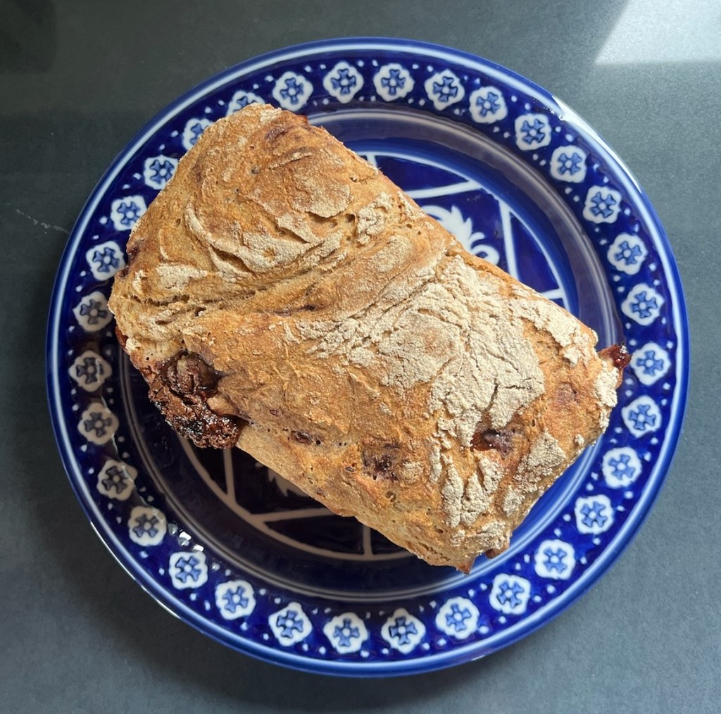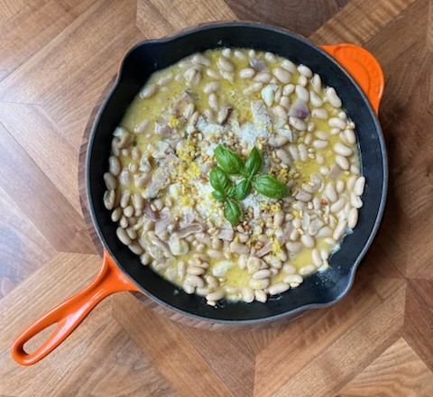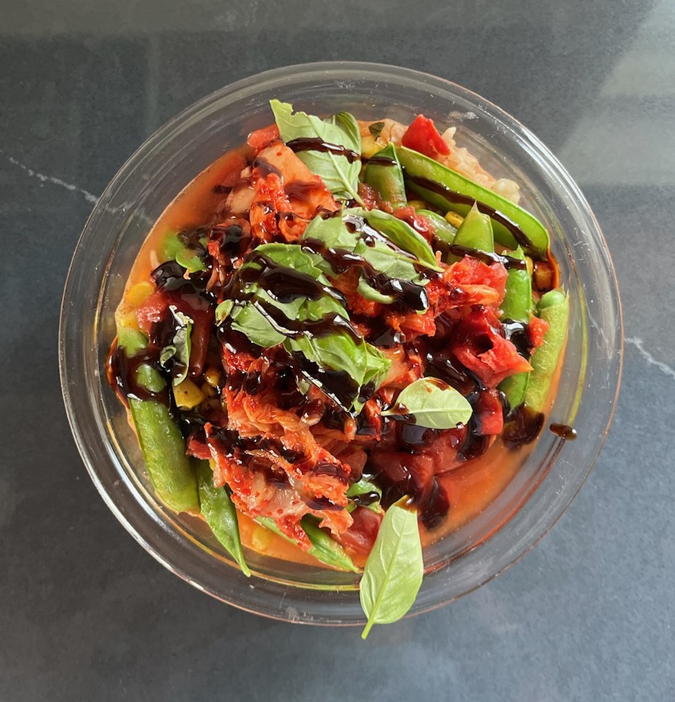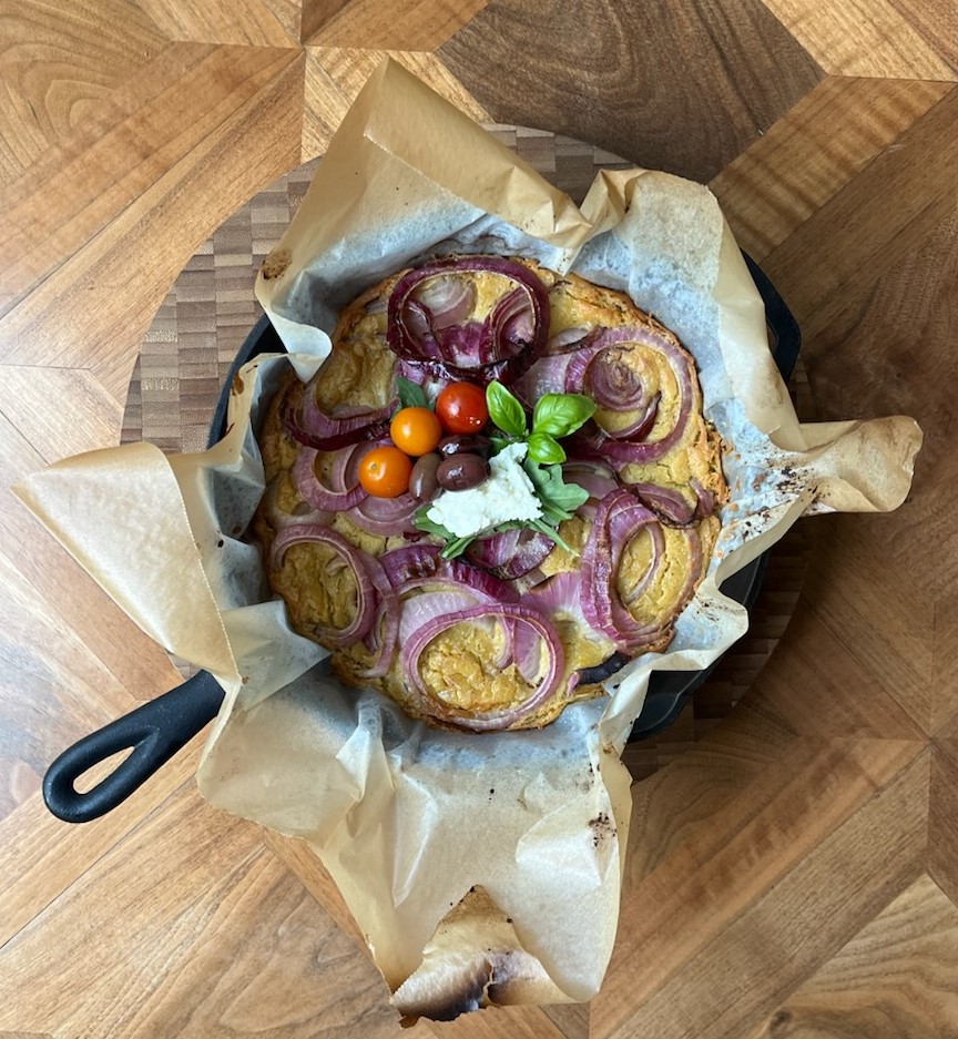1.5 c chickpea flour, 1/4 c olive oil, 2 c warm water, 1 t toasted sesame oil, s&p, rosemary, sage, 1 sliced red onion; toppings: arugula, vegan feta, olives, tomatoes, basil