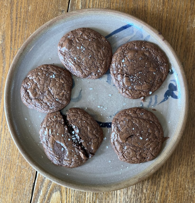 1 c wheat chef, 3/4 c full fat plain almond yogurt, 2 eggs, pinch sea salt, 1 T vanilla, 1 T cardamom, 10 packets stevia, 1 c lily’s stevia sweetened chocolate chips, 1.5 c white whole wheat flour, 1 c full fat oat milk