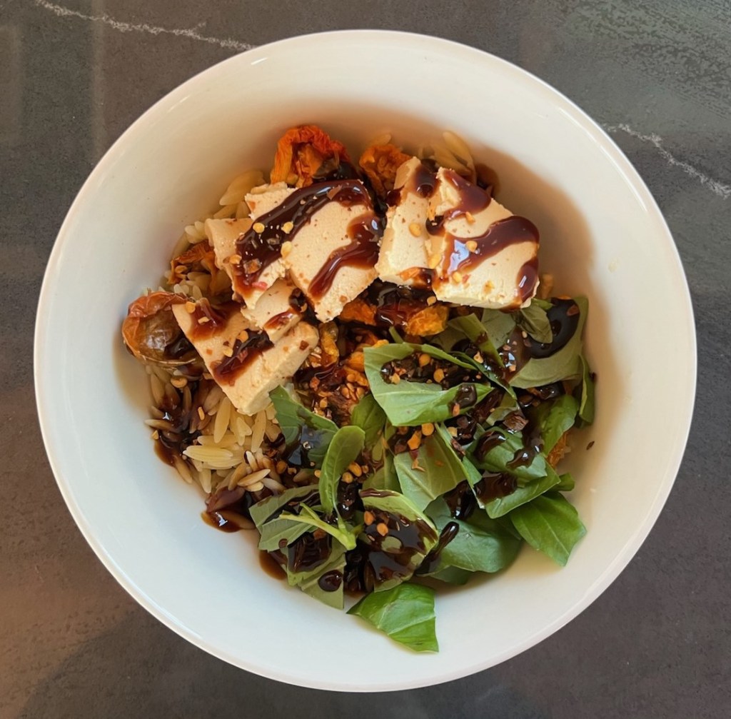 1 1/4 c cooked orzo, 1/2 c sundried tomatoes not oil packed, 1/4 c lemon juice; toppings: basil, balsamic glaze, red pepper flakes, black garlic nuts for cheese dairy free cheese