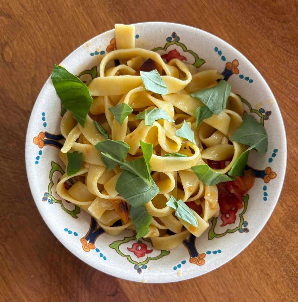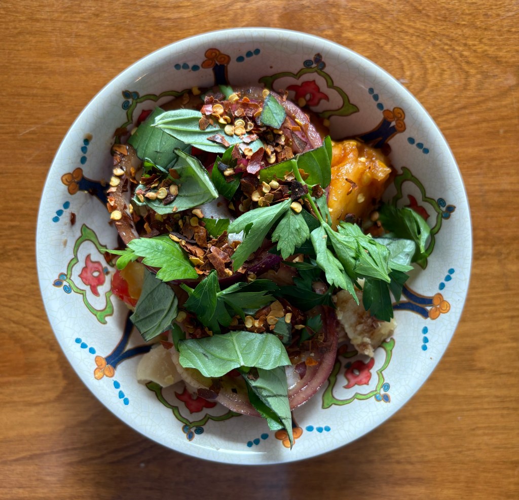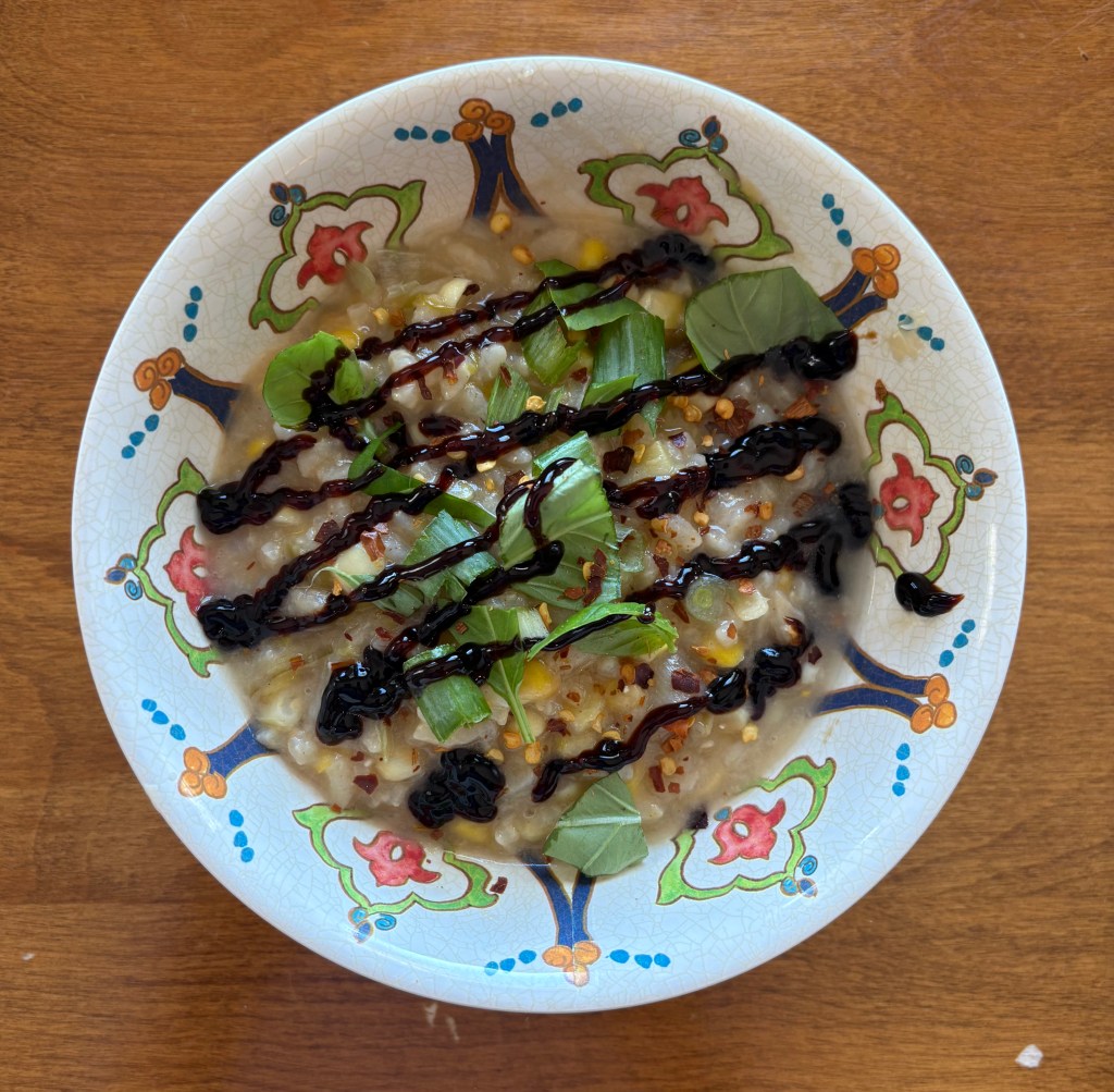 1 sliced leek, 2 T butter, s&p, 1 c arborio, 1/2 c wine, 6 c hot broth, kernels from 2 ears corn, 1 c shredded parm, 1/4 c cream; toppings: lemon juice, basil, green onion, red pepper flakes, balsamic glaze