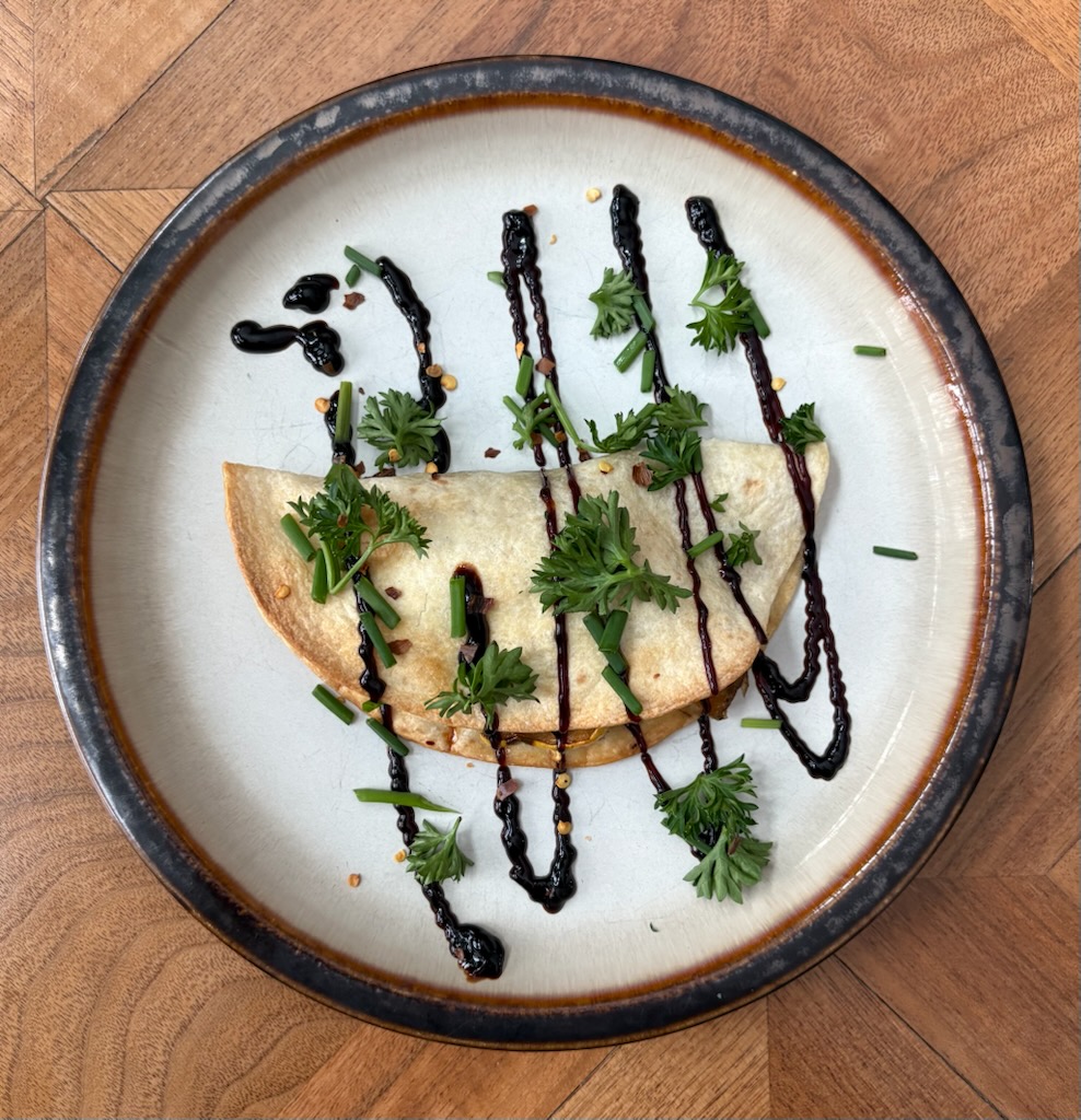 2 sliced delicata squash, 1 T olive oil, 1 T maple syrup, 1 t thyme, s&p, 1/4 c pecans, 8 tortillas; toppings: herbs, balsamic glaze, red pepper flakes