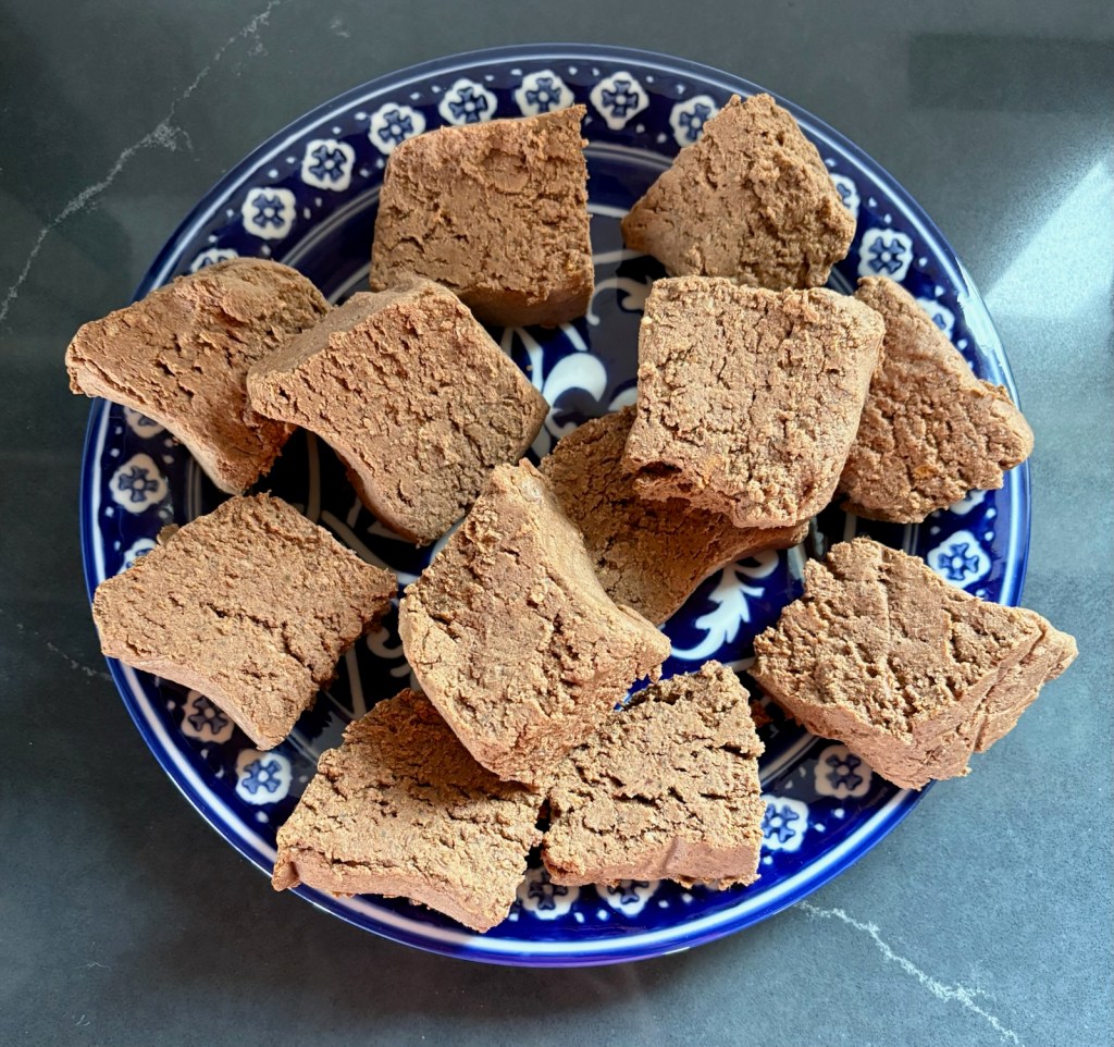 2 c pea protein, 1 c pb powder, 1 c ground flax+chia, 8 oz pumpkin puree, 1/2 t sea salt, 1/4 c cocoa, 1/4 c stevia, 2 T pumpkin spice, 2 T cardamom, 3 c unsweetened soy milk