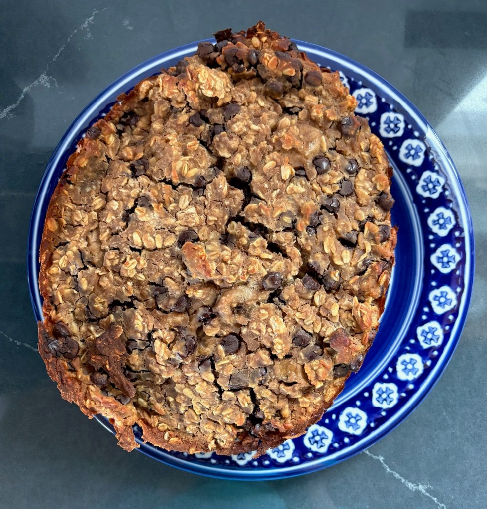 1 c wheat chef, 2 c pureed cooked yellow eye beans, 2 c oats, 12 oz frozen sliced bananas, pinch sea salt, 1 t stevia, 1 T vanilla, 1 bag lily’s stevia-sweetened chocolate chips, 8 oz kite hill vanilla unsweetened greek almond yogurt, 1 T cinnamon