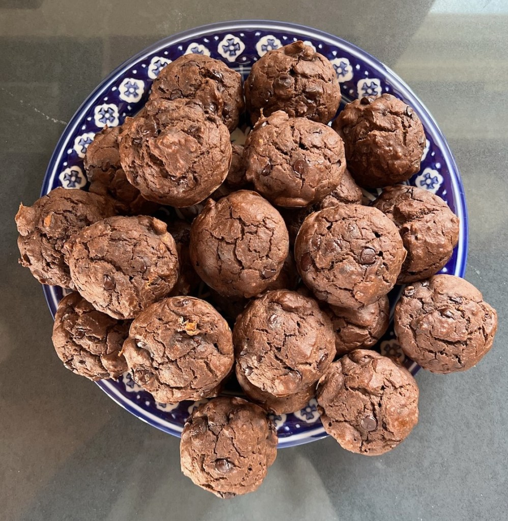 1 c wheat chef, 2 c white whole wheat flour, 1 can pumpkin, 3 eggs, 1/4 c full fat plain vegan yogurt, 1/2 c canola oil, 1/2 c sugar, 1/2 c brown sugar, 1 T cinnamon, 1 t powder, 1 t sea salt, 1/2 t soda, 2 t vanilla, 1/2 c cocoa, 1/2 c mini chocolate chips