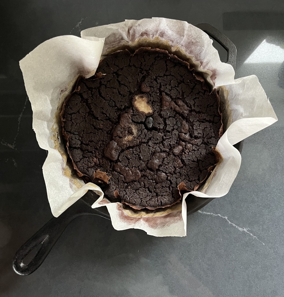 mix all but cocoa in silpat, swirl in cocoa; chill lid closed & covered 36 hours; place in cold oven set to 350 F, lid closed 80 minutes